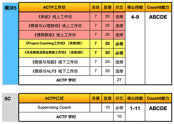 Coach8的课程设计是根据ICF要求的《11项核心技能》为基准,同时结合Coach8所设计的五大能力训练方向,设计出的一套综合训练专业教练的课程。Coach8的课程主要包括五大模块:第一模块主要是基础课程,第二模块是教练能力的提升,第三模块是ACC级别的工作坊(全面解析教练的过程),第四模块是精雕细刻PCC级别教练的能力,第五模块是PCC级别工作坊(通过长时间训练提升教练的教练状态和教练能力)。以下为:ICF《11项核心技能》、Coach8设计的五大能力,和相应的课程设计所对应的ICF核心能力及Coach8要求的五大能力表。